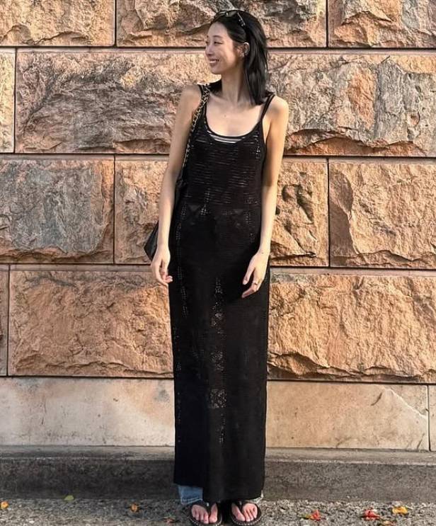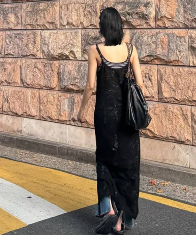 니트 조직감이 살아 있는 블랙 시스루 드레스를 입었지만, 안에는 스트라이프 톱과 데님 팬츠를 매치해 꾸민 듯 안 꾸민 듯한 무드를 완성했습니다.