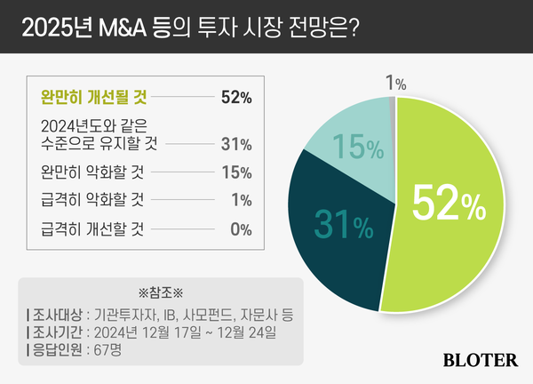 <블로터>와 <넘버스>가 지난해 12월17~24일 사모펀드(PEF) 운용사 등 GP와 출자자(LP), 투자 관련 자문사 등 자본시장 관계자 67명을 대상으로 설문조사를 실시한 결과, 응답자의 52%가 올해 M&A 시장이 완만히 개선될 것으로 예상했다. 응답자 수로는 35명이다.