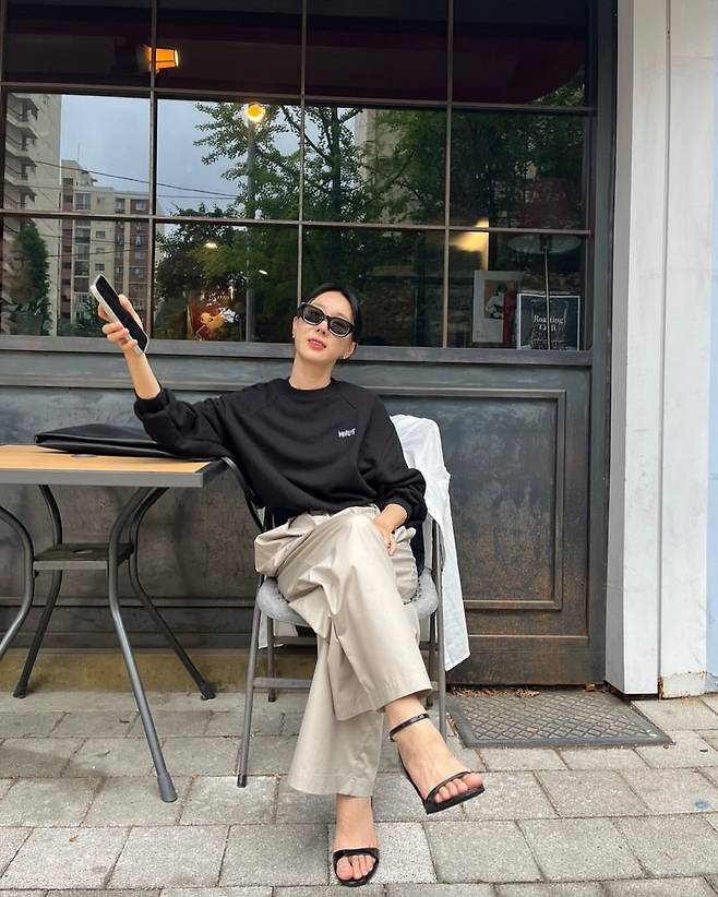 이지혜는 카페에서 촬영된 첫 번째 사진에서 블랙 맨투맨과 베이지 와이드 팬츠로 편안하면서도 세련된 캐주얼룩을 연출하고 있다. 선글라스를 착용해 도시적인 감각을 더했으며, 블랙 스트랩 샌들로 여름철 시원함까지 놓치지 않았다. 특히 베이지 컬러 팬츠는 블랙 톱과의 조화로 모던한 분위기를 완성했다.