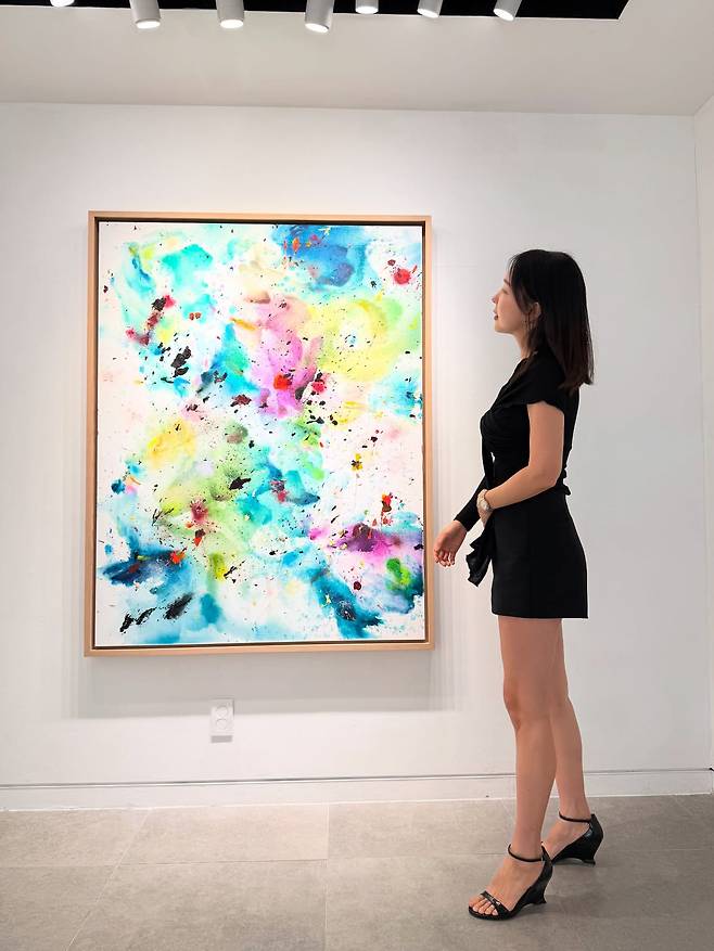 세 번째 사진에서는 블랙 미니 원피스로 우아함을 연출하고 있다. 갤러리라는 공간에 어울리는 심플하면서도 고급스러운 실루엣으로, 블랙 스트랩 힐과의 매치로 다리 라인을 길어 보이게 하는 효과까지 얻었다. 컬러풀한 추상화 작품 앞에서도 블랙 컬러가 주는 세련미가 돋보인다.