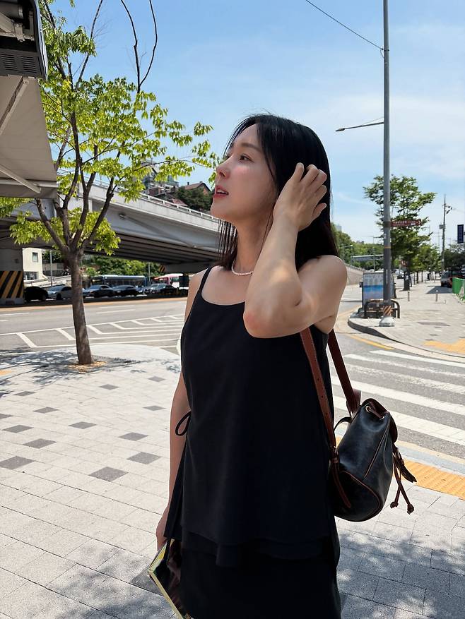 마지막 사진에서는 블랙 슬립 원피스로 여름철 데일리룩의 정석을 보여주고 있다. 브라운 컬러 크로스백으로 포인트를 주었으며, 자연스럽게 머리카락을 넘기는 포즈로 자연스러운 매력을 어필했다. 심플한 디자인이지만 몸매 라인을 살려주는 핏으로 여성스러움을 강조하고 있다.