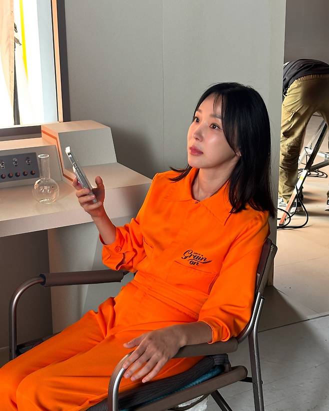 두 번째 사진에서는 화사한 오렌지 컬러 세트업으로 시선을 사로잡고 있다. 상하의 모두 같은 톤으로 매치한 원톤 코디네이션으로 통일감을 강조했으며, 'Going on' 레터링 디테일이 포인트가 되어 캐주얼한 매력을 더했다. 실내 촬영 환경에서도 밝은 컬러가 돋보이는 스타일링을 선보였다.