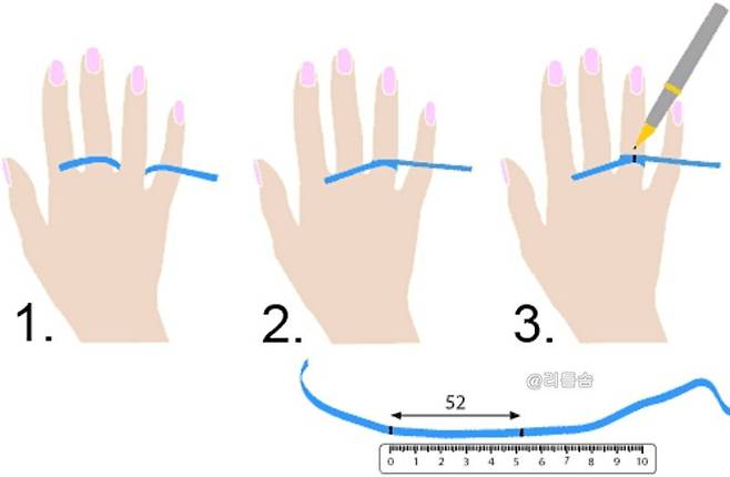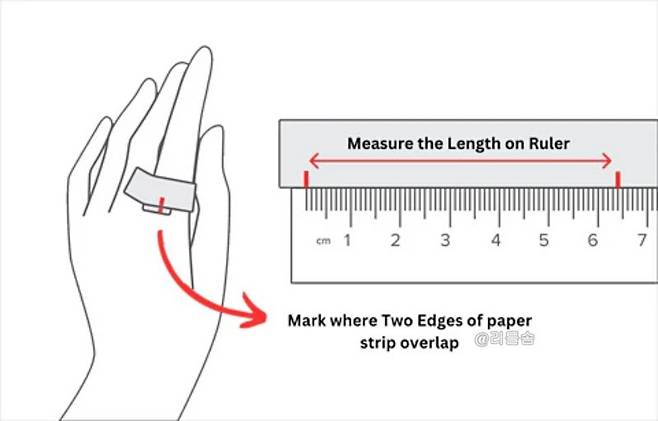 바로 그 길이가 당신의 손가락 둘레입니다. 이제 이 둘레 길이를 아래 표와 비교해 보기만 하면 끝! 정말 간단하죠?
