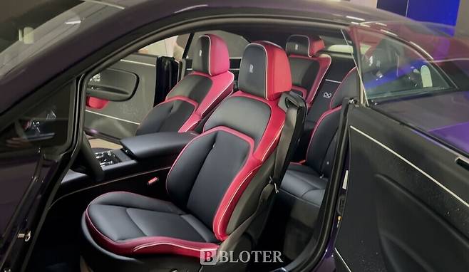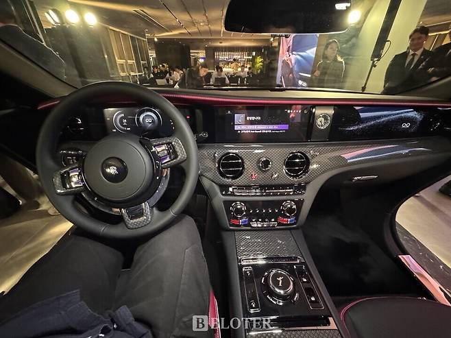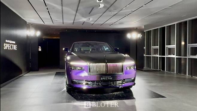롤스로이스서울 전시장에 배치된 블랙배지 스펙터의 외관색상은 ‘베이퍼 바이올렛’이다. 검정과 보라색이 섞인 이 외관 색상은 1980~90년대 클럽 문화의 네온 색채에서 영감을 받아 탄생됐다는 것이 롤스로이스의 설명이다.