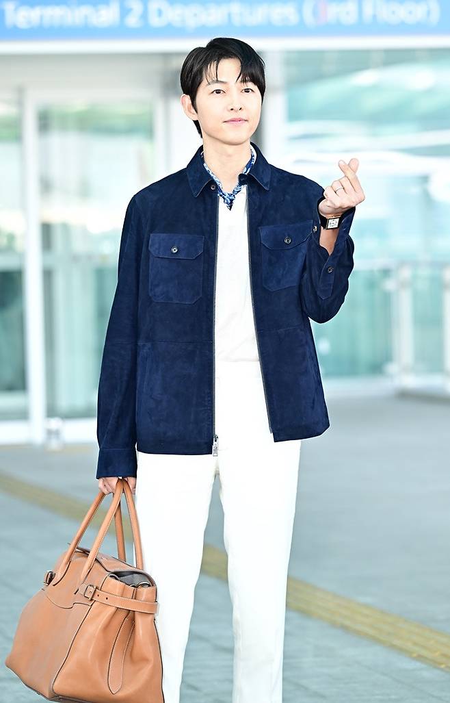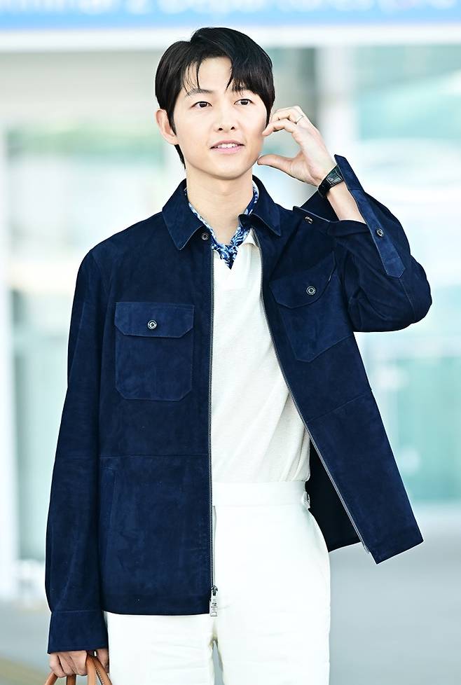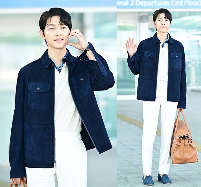 이날 송중기는 군더더기 없이 깔끔한 실루엣의 네이비 스웨이드 재킷과 반팔 스웨터, 화이트 실크 리넨 팬츠 등을 매치해 클래식 무드의 럭셔리하면서 세련된 간절기 패션을 완성했다.