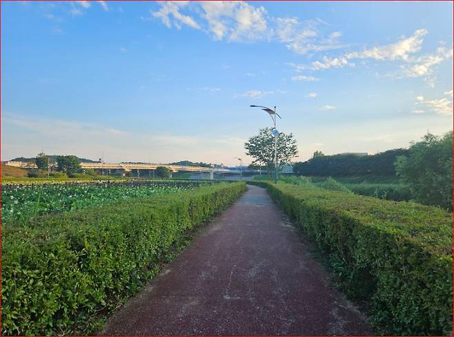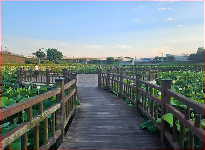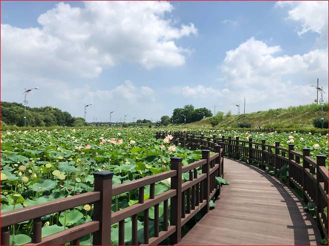 조천연꽃공원은 연못 주변으로 잘 조성된 데크 산책로와 자전거길이 특징입니다.나무 그늘 아래로 걷다 보면 어느새 바람결에 흔들리는 연꽃잎과 잔잔히 흐르는 조천이 마음까지 맑게 만들어 줍니다.걷기 좋은 테크길 아래로는 조천이 조용히 흐르고 있어, 더운 여름 한낮에도 부담없이 산책할 수 있습니다.