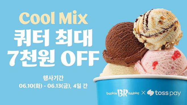배스킨라빈스는 13일까지 매장에서 아이스크림 쿼터 사이즈(18,500원)를 구매하는 모든 고객에게 4천원 할인 혜택을 제공한다. 토스페이로 전액 간편 결제 시 3천원 추가 할인이 더해져, 최대 7천원까지 가격 혜택을 받을 수 있다. 이벤트 참여 매장 등 자세한 내용은 배스킨라빈스 공식 홈페이지에서 확인 가능하다.