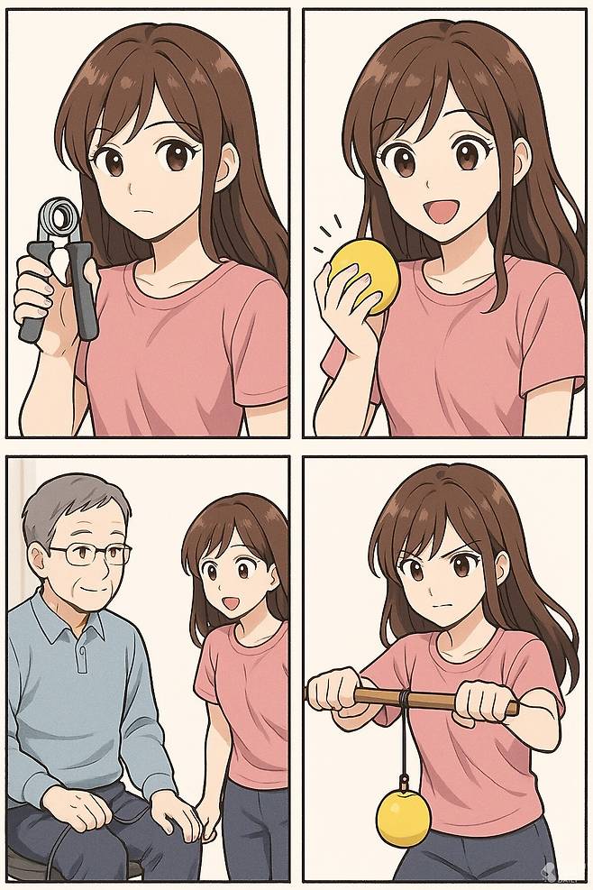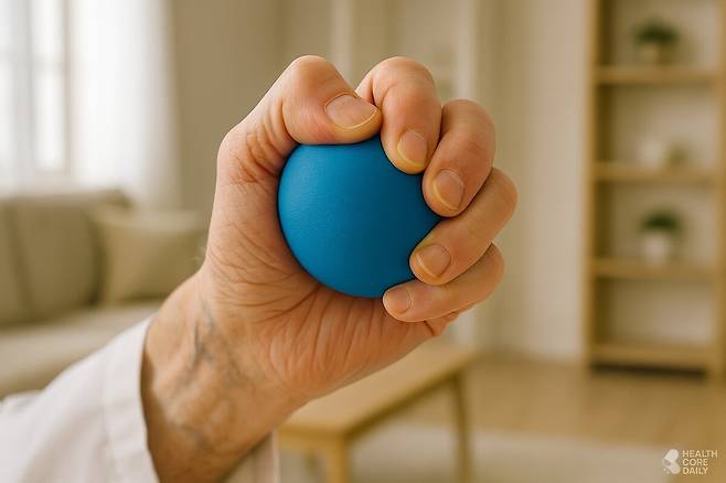 보다 간단한 방법으로는 테니스공이나 작은 고무공을 활용할 수 있다. 손에 쥐었다가 펴는 동작을 반복하는 것만으로도 손 근육 강화에 도움이 된다.