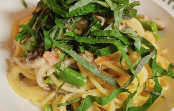 생깻잎을 가볍게 채 썰어 파스타 위에 얹으면, 오일리한 질감을 상큼하게 마무리해준다. 열을 가하면 향이 많이 날아가므로 조리 후 마지막에 넣는 것이 가장 좋다. 깻잎은 바질보다 향이 강하지만, 그만큼 재료 자체의 풍미가 약한 두부·버섯·닭가슴살 파스타와도 잘 어울리는 궁합을 만들어낸다.