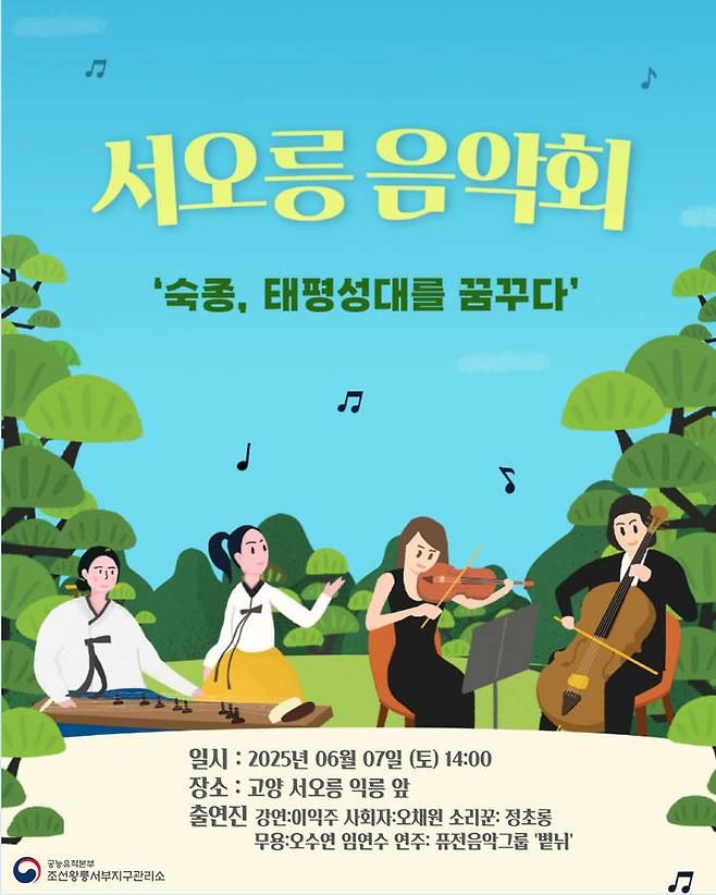 국가유산청 조선왕릉서부지구관리소에 따르면 7일 오후 2시에 열리는 '서오릉 음악회-숙종 태평성대를 꿈꾸다'는 서오릉 중 명릉의 주인인 조선 제19대 왕 숙종의 정치적 지도력과 업적을 음악과 강연, 무용으로 새롭게 조명하는 자리다.