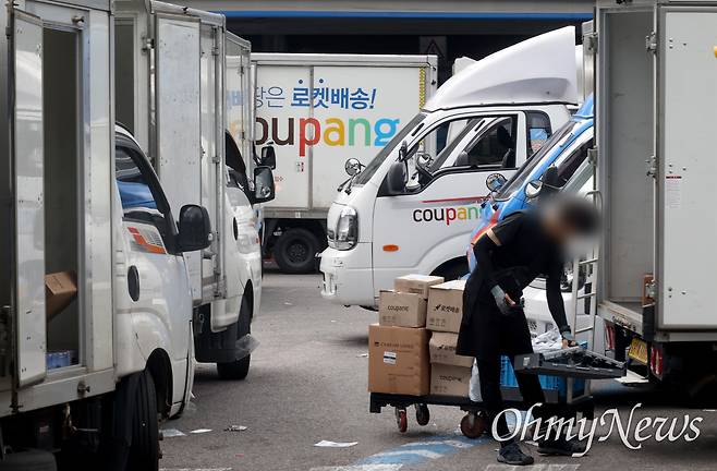 | ▲ 택배 노동자의 과로를 막기 위해 지정된 ‘택배 없는 날’에 쿠팡이 끝내 동참을 거부한 14일 오후 서울 시내 한 쿠팡 배송 캠프에서 택배 노동자가 배송 준비 작업을 하고 있다. |