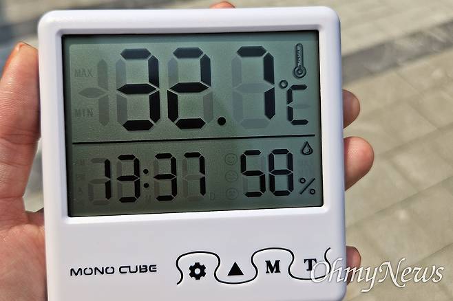 | ▲ 14일 오후 1시 30분께 전자 온도계에 32.7도씨가 찍혔다. |