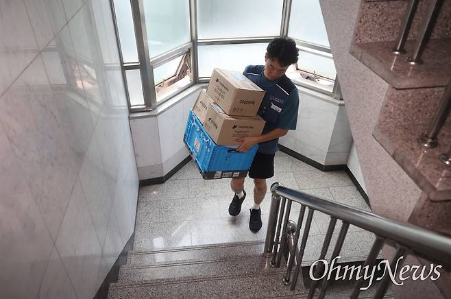 | ▲ 택배 노동자의 과로를 막기 위해 지정된 ‘택배 없는 날’에 쿠팡이 끝내 동참을 거부한 14일 오후 서울 강남구에서 강민욱 쿠팡 택배 노동자가 택배를 배달하고 있다. |