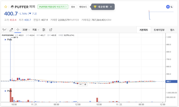코인원이 지난 20일 가상자산 퍼퍼(PUFFER)를 원화 마켓에 신규 상장했다. 코인원에 따르면 퍼퍼는 이더리움 기반의 스테이킹 플랫폼이다. 유저들은 이더리움을 스테이킹해 'puf이더리움'를 받아 이더리움 블록 보상 및 아이겐레이어 리스테이킹 보상을 동시에 얻을 수 있다. 퍼퍼는 퍼퍼 파이낸스 생태계 내의 거버넌스 토큰이다.