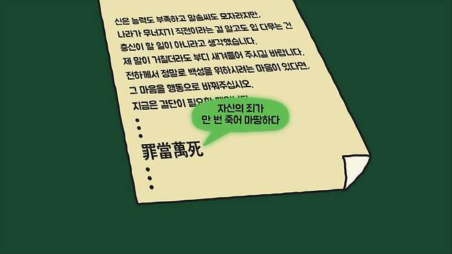 정경세는 광해군의 정책을 조목조목 꼬집으며 비판했고, 상소 말미에 '罪當萬死(죄당만사)'라고 적었습니다. 그 의미는 '자신의 죄가 만 번 죽어 마땅하다'는 것인데, 이걸 본 광해군은 진짜로 강력하게 처벌하려 했습니다.