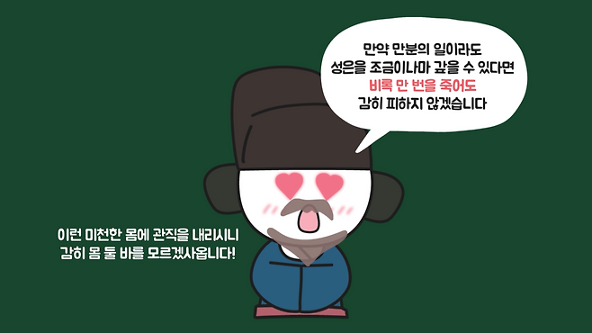 여기서 주제의 궁금증이 생깁니다. 이러한 표현을 신하들이 실제로도 사용했을까요? 만약 사용했다면 그 말에 따라 죽은 경우도 있었을까요? 국사편찬위원회 편사연구사 김한빛님이 투고한 원고를 바탕으로 조선시대 때 어땠는지 한 번 알아보겠습니다.