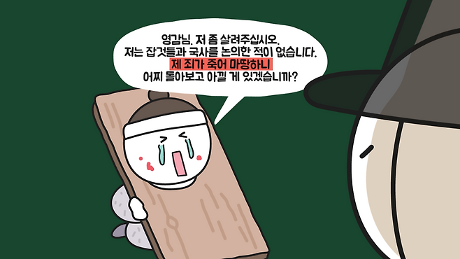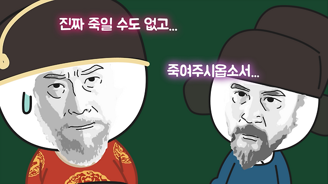 그런데 이들 표현 외에도 사극에서 자주 등장하는 표현이 "죽여주시옵소서. 전하"입니다. 주로 임금에게 직언할 때나 진짜 잘못한 일이 있을 때 사용하는데, 이 표현에 내포된 진짜 의미는 상황에 따라 다르긴 해도 진짜 죽여달라는 의미는 아닙니다.