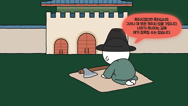 이외에도 조선 말기 개항과 외국과의 수교를 반대한 최익현의 사례가 있습니다. 그는 서울에 도끼를 가져가 궐 앞에 내려놓고 앉은 뒤 상소에 말 그대로 자신을 죽일 테면 죽여보라는 아주 과격한 표현을 써서 올렸습니다.