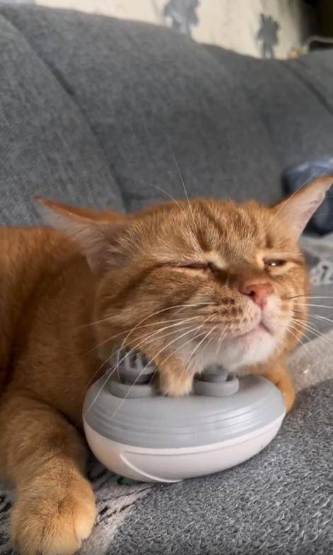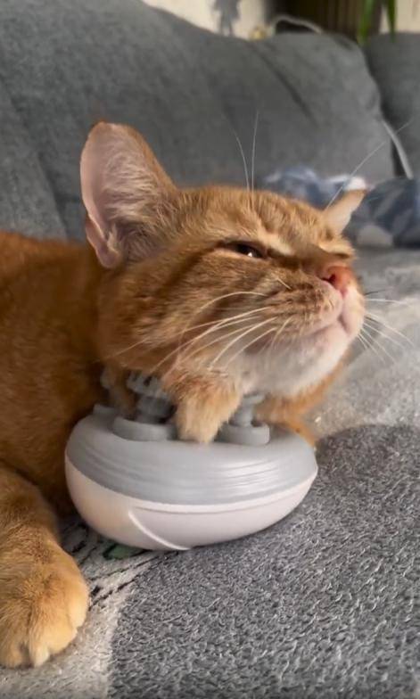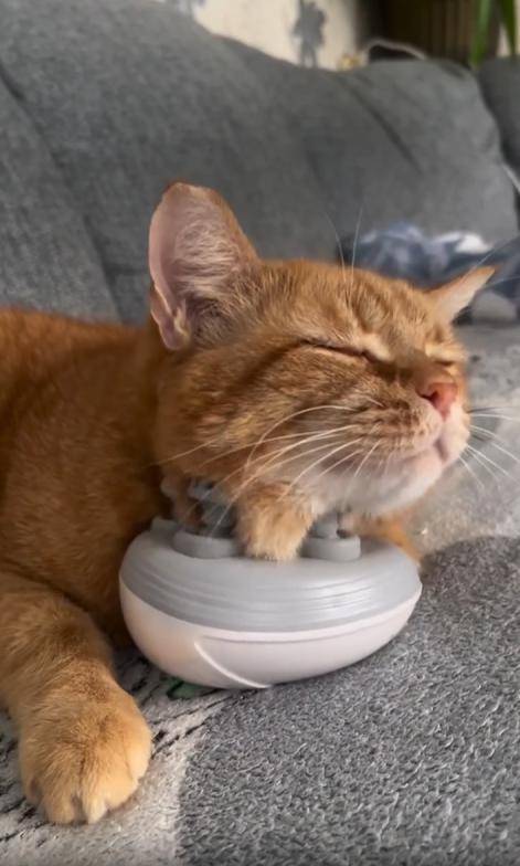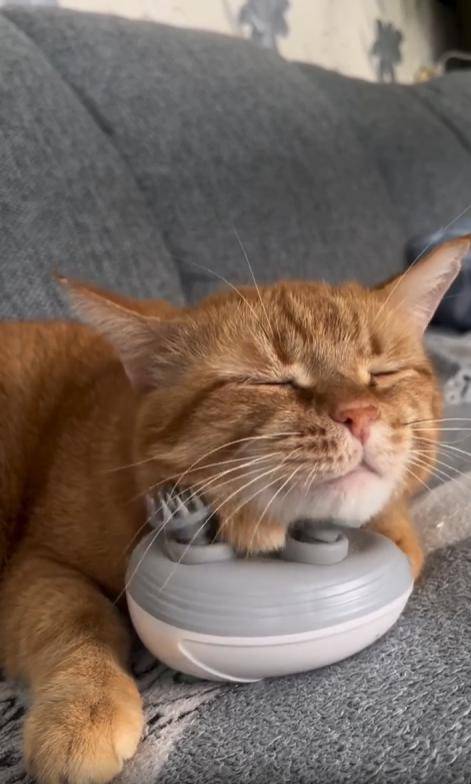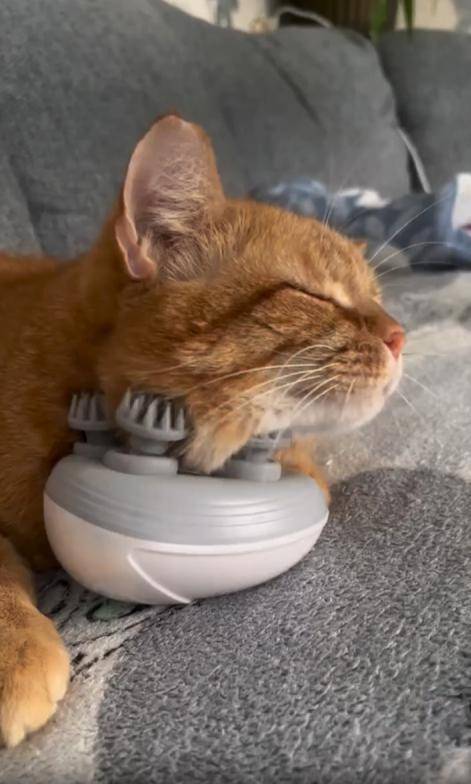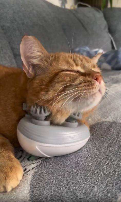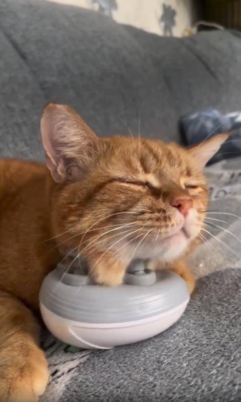 조용한 거실, 푹신한 소파 위에 한 마리의 고양이가 길게 누워 있습니다. 몸은 느슨하게 풀어져 있고, 앞발은 양옆으로 자연스럽게 벌어져 있습니다. 하지만 오늘의 하이라이트는 따로 있습니다. 바로 고양이의 턱 아래—작동 중인 작은 안마기가 놓여 있는 것이죠.