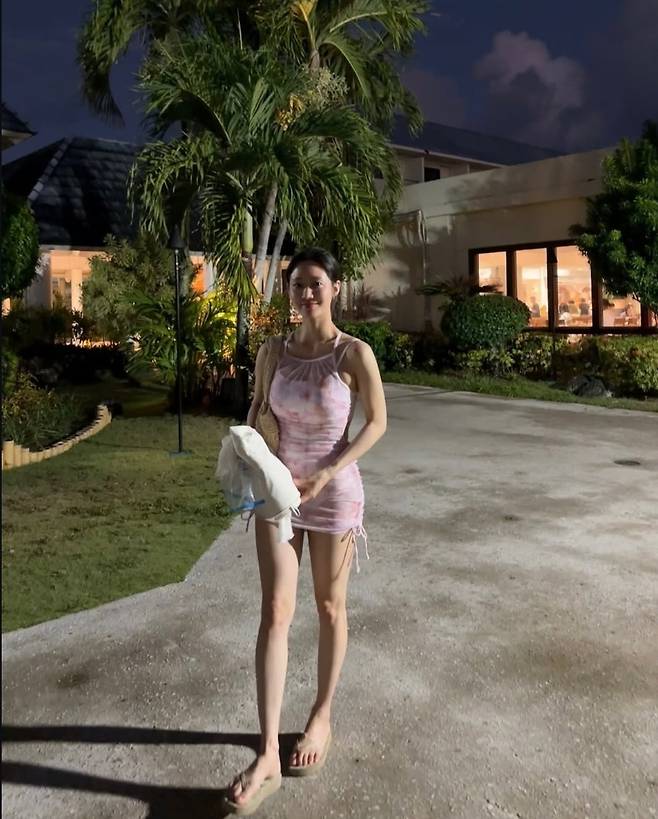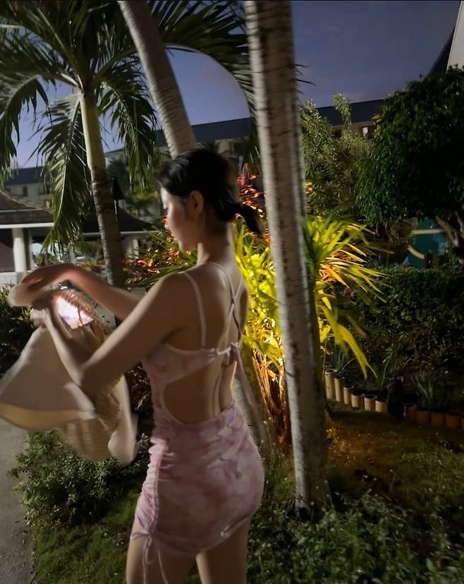 한그루는 핑크색 타이다이 패턴의 초밀착 미니 원피스로 탄탄한 바디라인을 강조했고, 등과 허리를 드러내는 백리스 디자인으로 과감한 포인트를 더했습니다.
