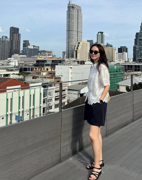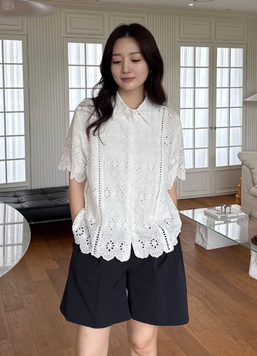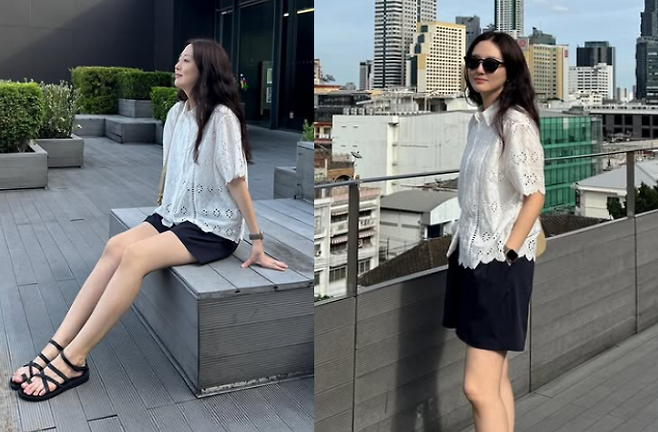 김소영은 최근 여행 중, 펀칭된 화이트 블라우스와 블랙 숏팬츠를 매치하여 여유로운 여행 룩을 완성했습니다.