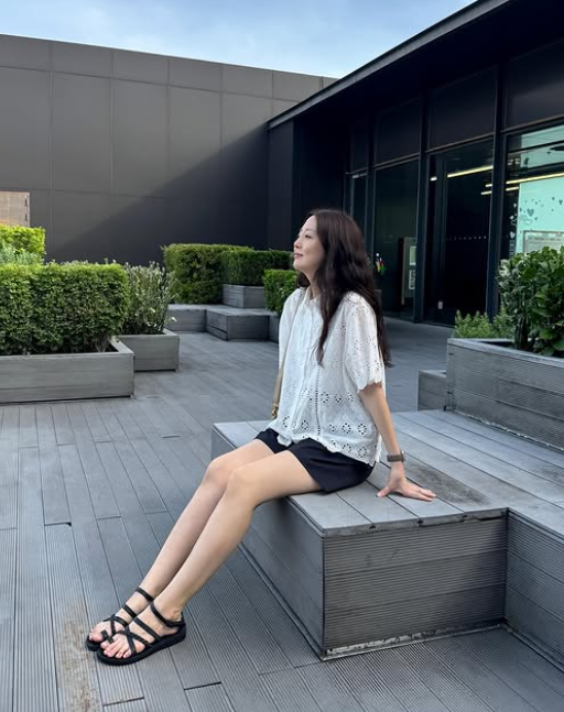 화이트 블라우스는 깔끔하고 신선한 느낌을 주며, 가벼운 바람에 자연스럽게 휘날리는 모습이 여유를 더했습니다. 여기에 스트랩 샌들을 착용하여 발을 편안하게 보호하면서도 여름 분위기를 물씬 풍기고, 와이드한 선글라스로 스타일리시함을 강조했습니다.