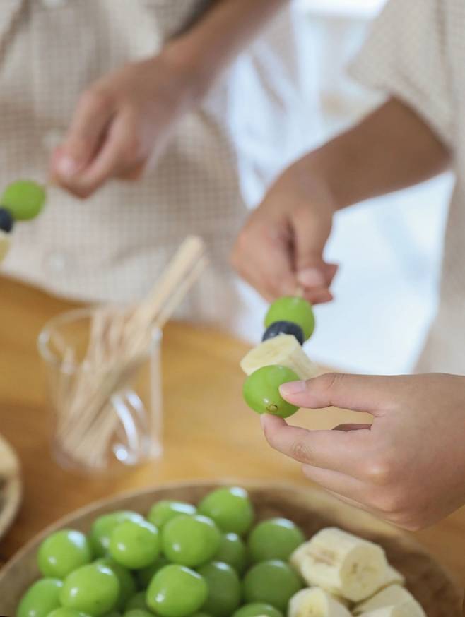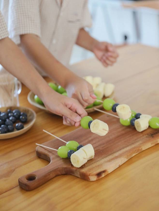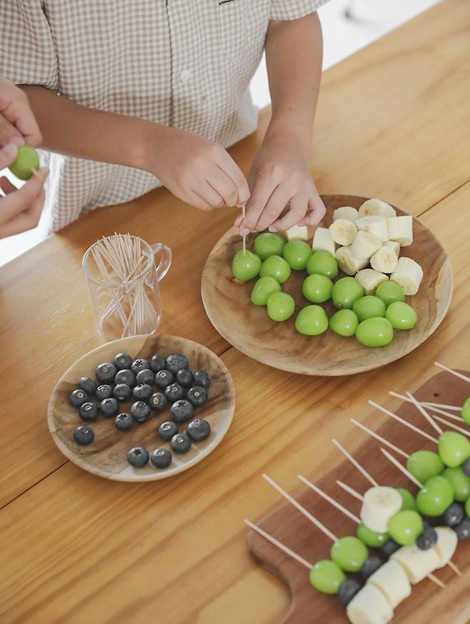 꼬지에 과일을 꽂아줍니다. 아이들이 아주 좋아하더라고요. 꼬지는 쉽게 끼울 수 있어서 아이들이 요리에 참여할 수 있도록 하기 참 좋아요. 다만, 손에 찔리지 않게 주의하며 잘 꽂도록 해주세요.