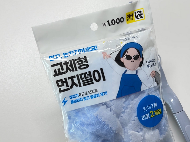 본품과 리필 2개가 들었는데도 가격은 천원인 교체형 먼지떨이 제품이에요.