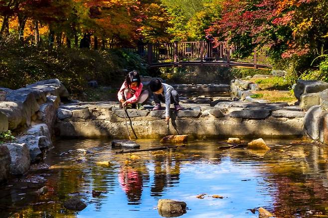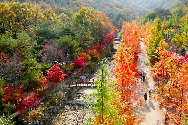 가을 시즌에 이곳에 방문한다면 초입부터 붉은빛의 메타세쿼이아 숲길이 이어지고 걷는 곳마다 빼어난 경치를 자랑합니다. 산책로 바로 옆에는 빨간 향을 머금은 계곡도 있는데요. 물에 비친 형형색색의 풍경과 가족이 오순도순 모여 즐기는 힐링 여행은 소중한 추억을 쌓기에 부족함이 없을 겁니다.