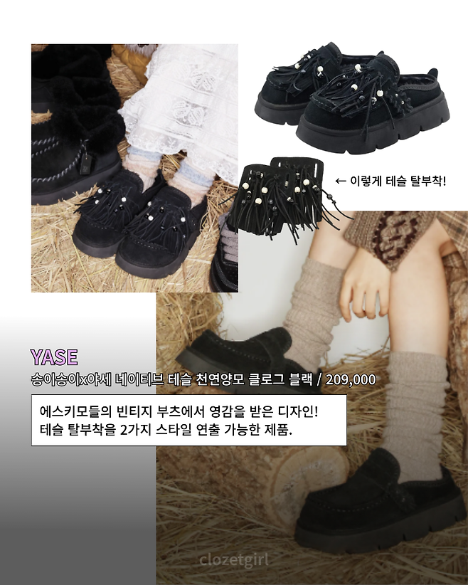 송이송이x야세 네이티브 테슬 천연양모 클로그 블랙 / 209,000