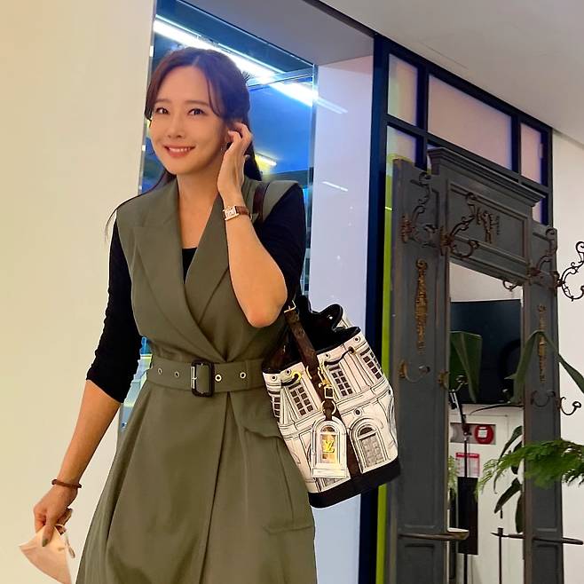소유진은 카키색 벨티드 롱 베스트에 블랙 이너를 매치해 세련된 오피스룩을 연출하고 있다. 허리 라인을 강조하는 벨트와 건축적인 프린트가 돋보이는 버킷백으로 포인트를 더해, 도시적이면서도 감각적인 스타일링을 완성했다. 심플한 시계와 자연스러운 헤어스타일이 전체적인 룩의 세련미를 배가시킨다.