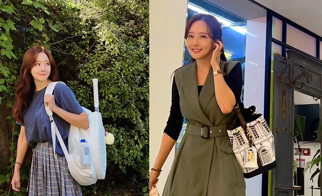 네이비 티셔츠와 체크 플리츠 스커트 조합으로 발랄한 데일리룩을 선보였다. 여기에 화이트 테니스 백을 어깨에 멨고, 라켓이 살짝 드러나 스포츠 무드를 강조한다. 손목의 얇은 머리끈과 작은 액세서리가 자연스러운 포인트로 작용하며, 야외의 녹음과 어우러진 경쾌한 분위기가 인상적이다.