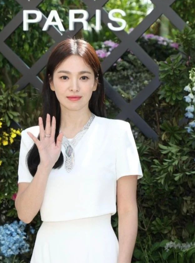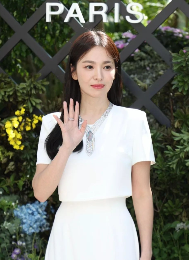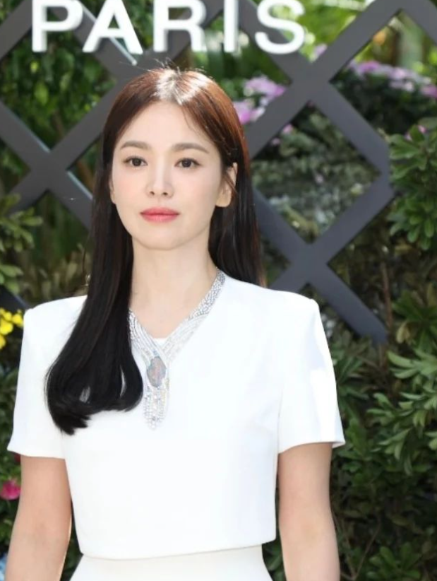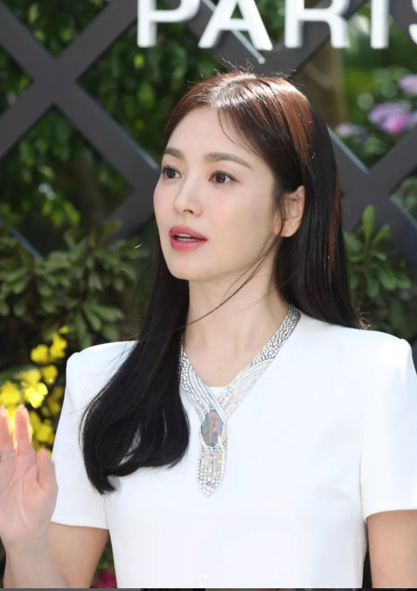송혜교는 긴 생머리를 단정하게 늘어뜨려 우아하고 고급스러운 이미지를 강조했다.