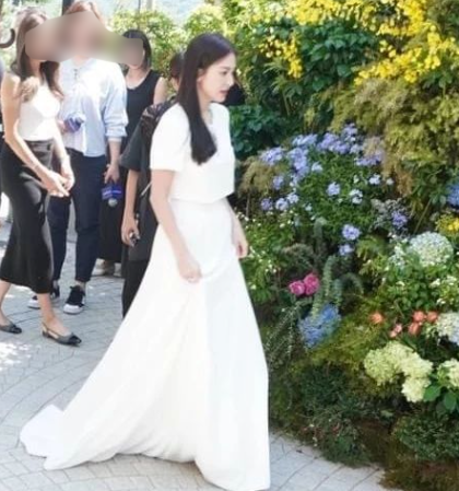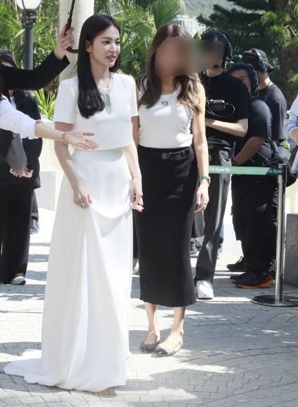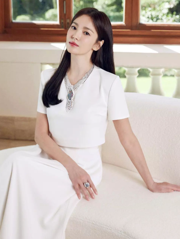 송혜교는 화이트 롱드레스를 입고 단아하고 청순한 분위기로 시선을 사로잡았다.