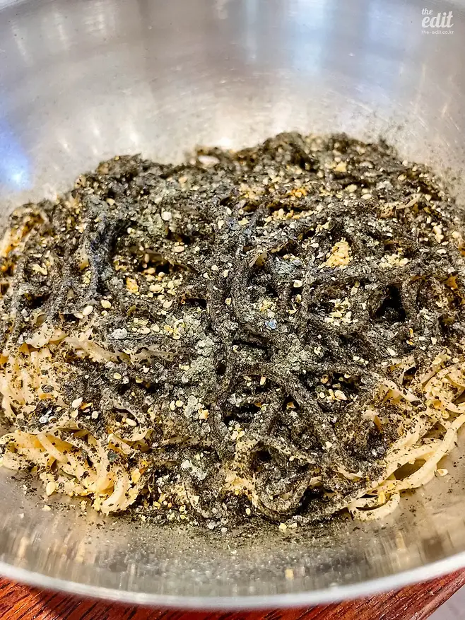 그런 의미에서 들기름막국수는 다소 아쉬운 음식이다. 코를 강타하는 들기름 향을 이겨내기에 메밀 향은 너무나 섬세하다. 특히 이 신종 면 요리를 처음 개발한 ‘고기리막국수’는 면을 들기름과 간장 소스에 버무리고 김 가루와 깨 가루를 수북이 올려놨다. 더 메밀 향을 느끼기 어렵다. 그래도 맛있긴 하다. 들기름이 워낙 신선하고, 미세할 정도로 잘게 부순 김 가루와 깨 가루가 면과 혀에 빈틈없이 들러붙어 고소한 맛을 최대치로 끌어 올렸다. 나는 개인적으로 이 집의 가장 큰 비법은 김과 깨의 입자에 있다고 본다. 최대한 잘게 부수는 게 비법. 하지만 외진 곳까지 차를 끌고 가 교통 체증에 시달리고 1시간 넘게 기다려 먹을 만한 맛인지는 모르겠다. 요즘은 워낙 잘 관리되고 유통되는 들기름이 많아 집에서도 신선하고 맛있는 들기름을 즐길 수 있다. 거기에 김과 깨는 더 쉽게 구할 수 있는 재료다. 물론 김과 깨를 최대한 잘게 부수는 수고는 각오해야 하지만. 100% 메밀 함량의 면도 인터넷을 통해 쉽게 구매할 수 있다.