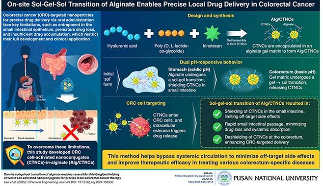 논문 제목은 ‘위장관 내 sol-gel-sol 변환 및 암세포 특이적 나노복합체를 응용한 경구용 국소 대장암 표적 치료(On-site sol-gel-sol transition of alginate enables reversible shielding/deshielding of tumor cell-activated nanoconjugates for precise local colorectal cancer therapy)’다.