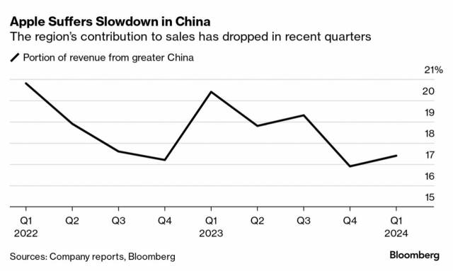 중국은 애플의 사업에서 빼놓을 수 없는 지역이다. 회사 매출의 약 20%가 중국에서 나오기 때문이다. 특히 생산의 의존도는 절대적이라는 평가가 많다. 이에 최근 애플은 중국에 쏠린 비중을 줄이기 위해 인도 등으로 시장 다변화를 시도하지만 빠른 시일 내 쉽지 않다는 관측이 지배적이다. 이런 상황에서 이번 분기 중국에서 예상보다 더 못한 성적을 내면서 시장의 우려를 키우는 분위기다.