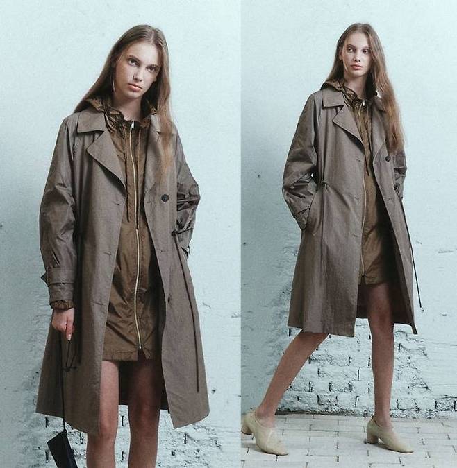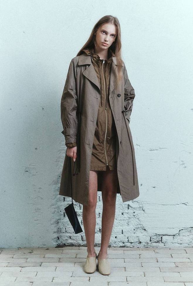'쁘렝땅' 아노락 트렌치 코트는 얇고 바스락거리는 텍스처가 특징이며 손으로 구긴 듯한 잔잔한 크링클 텍스처가 고급감을 선사한다.