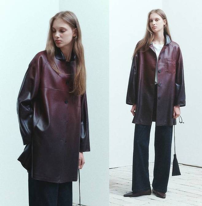 발마칸 형태의 그라데이션 하프 기장 가죽 코트로 밑단에 홀을 주어 여성스러우면서 유니크한 실루엣을 연출한다.
