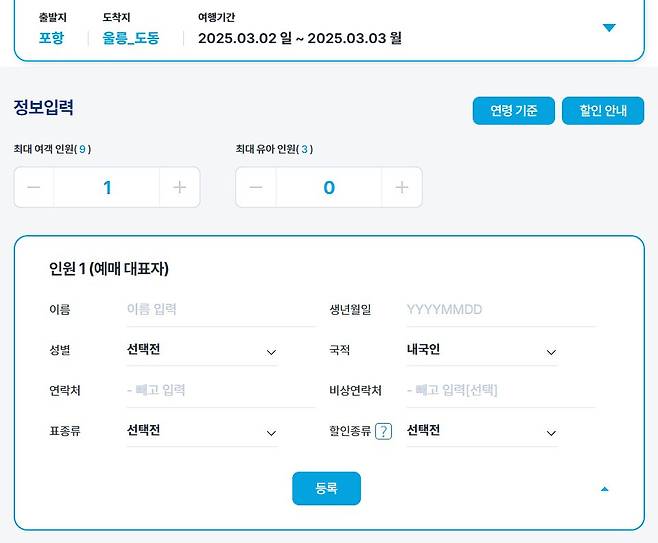 좌석을 고르셨다면, 다음 단계에서는 탑승자 인적 사항을 정확히 입력해야 합니다. 혼자 울릉도 여행이라면 본인 것만 작성하면 상관없지만, 일행이 있는 경우 모든 탑승객의 이름, 생년월일, 성별, 국적, 연락처(비상까지), 표(할인) 종류 등을 정확히 기재해야 합니다.