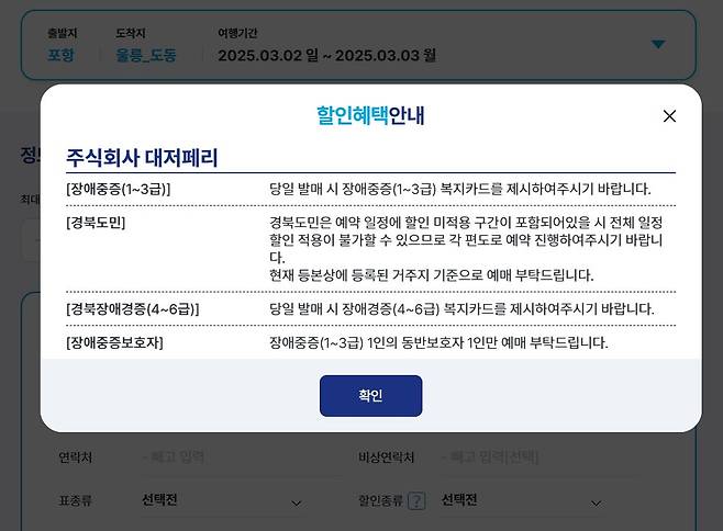 실제 울릉도 배편에 탑승하는 여행객과 정보가 다를 경우, 승선이 거부가 될 수 있으니 꼭 확실하게 작성해 주세요.