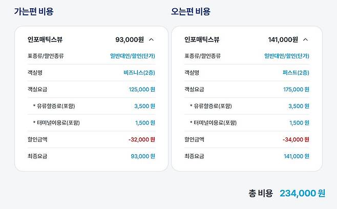 여행 기간(출발일, 귀항일)을 정해주세요. 상단에 편도와 왕복을 '꼭' 체크해서 확인하기를 누르셔야 됩니다.
