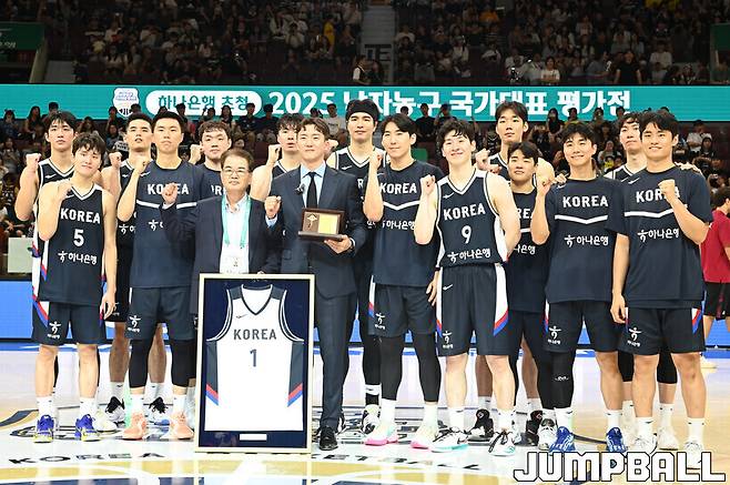 20일 안양 정관장 아레나에서 열린 하나은행 초청 2025 남자농구 국가대표 평가전 카타르와 맞대결 전반전 종료 후 박찬희 코치의 은퇴식이 진행됐다. 헌정 영상이 상영됐고, 이벤트를 통해 초청된 팬이 함께해 그 의미를 더했다. 가족들과 대표 선수들 등까지 모두 나와 사진을 찍으며 축하했다.