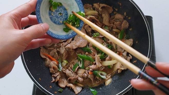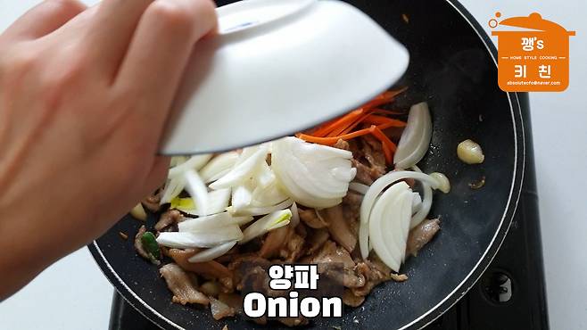 10. 고기 핏기 없어지면 당근, 양파 볶기