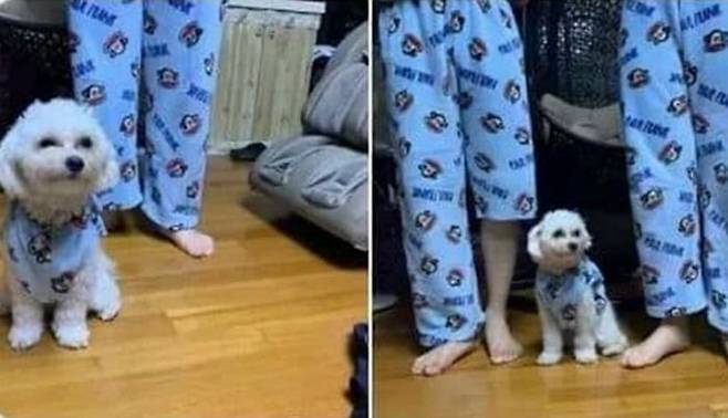 결과는 그야말로 대성공이었습니다. 공개된 사진 속 반려견은 엄마가 만들어준 잠옷을 입고 아주 편안하고 만족스러운 표정을 짓고 있습니다. 무엇보다 집사의 바지 패턴과 완벽하게 일치하는 커플룩을 입고 나란히 서 있는 모습은 보기만 해도 절로 미소가 지어집니다.