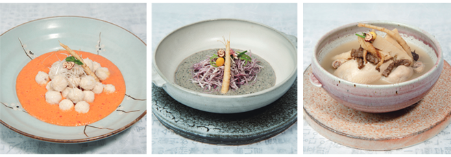 두 번째는 봄봄삼계탕입니다. 안토시아닌 색소가 풍부한 복분자와 항산화 효과가 탁월한 검은콩을 갈아 잘게 찢어낸 닭고기 위에 곁들여 먹는 삼계탕입니다. 복분자와 검은콩은 시력 감퇴를 늦추고, 피로회복과 노화를 억제하는 데도 좋습니다. 복분자가 없다면 포도, 자색고구마, 블루베리, 비트 등을 넣어도 비슷한 맛을 낼 수 있다고 하니 참고하시면 좋겠습니다.
