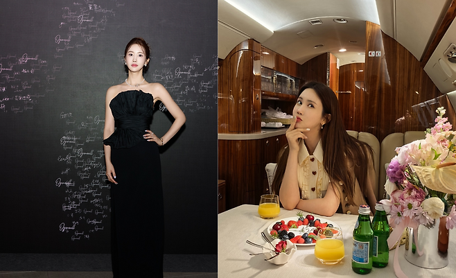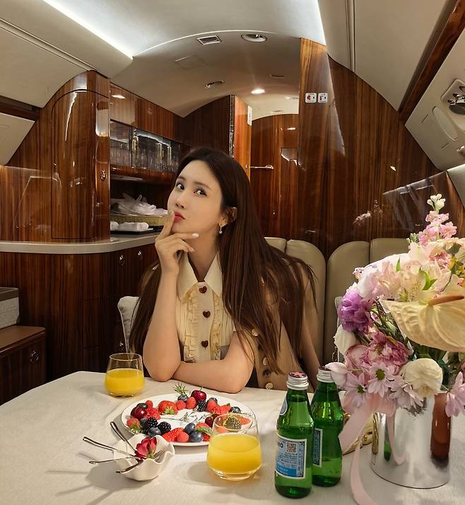 프라이빗 제트 내부에서 베이지 톤의 셔츠 드레스를 착용한 모습이다. 하트 모양의 버튼 디테일이 돋보이는 드레스로 캐주얼하면서도 고급스러운 느낌을 연출하고 있다. 신선한 과일과 꽃이 놓인 테이블 세팅과 함께 여유로운 라이프스타일을 보여주고 있다.