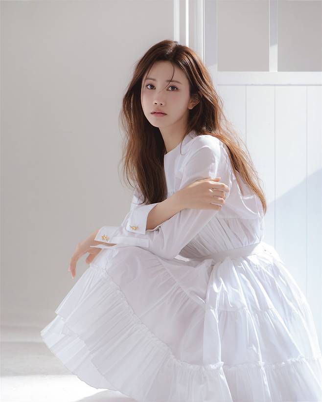 순백의 티어드 드레스로 로맨틱한 무드를 연출하고 있다. 볼륨감 있는 소매와 레이어드된 스커트가 특징적이며, 골드 액세서리로 포인트를 주어 우아함을 강조했다. 미니멀한 화이트 배경과 어우러져 청순하면서도 세련된 분위기를 자아내고 있다.