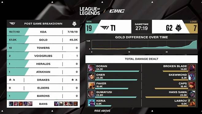 하지만 여전히 주도권은 T1에게 있었고, 참착하게 운영을 이어갔다. 기본에 충실한 플레이를 잘 펼친 T1은 25분 교전에서 승리하며 바론 사냥까지 성공해 격차가 이전보다 더 벌어졌다. 바론 버프와 함께 상대에게 시간을 주지 않고 공격을 이어간 T1이 27분 만에 G2의 넥서스를 파괴하고 1:0을 만들었다.