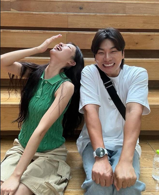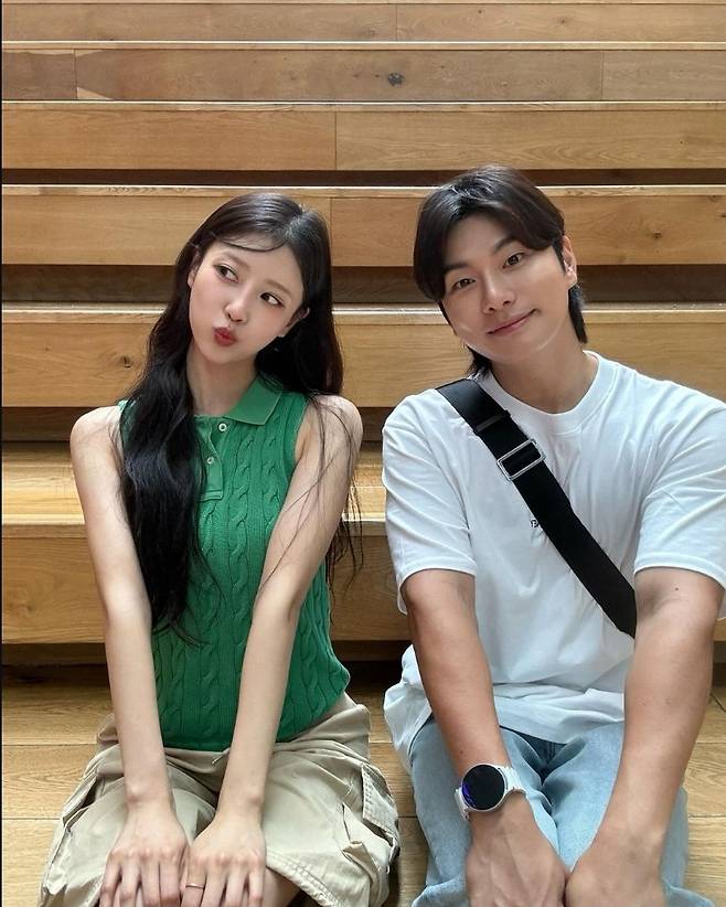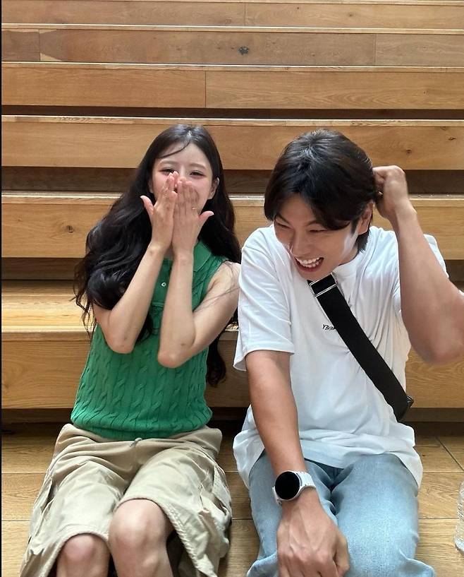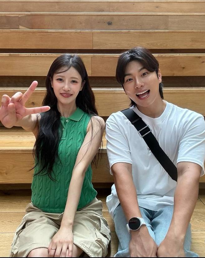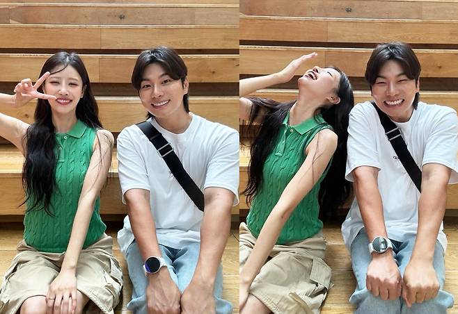 또, 이미주는 베이지 카고 반바지를 매치해 힙하고 스타일리시한 코디를 완성했습니다.